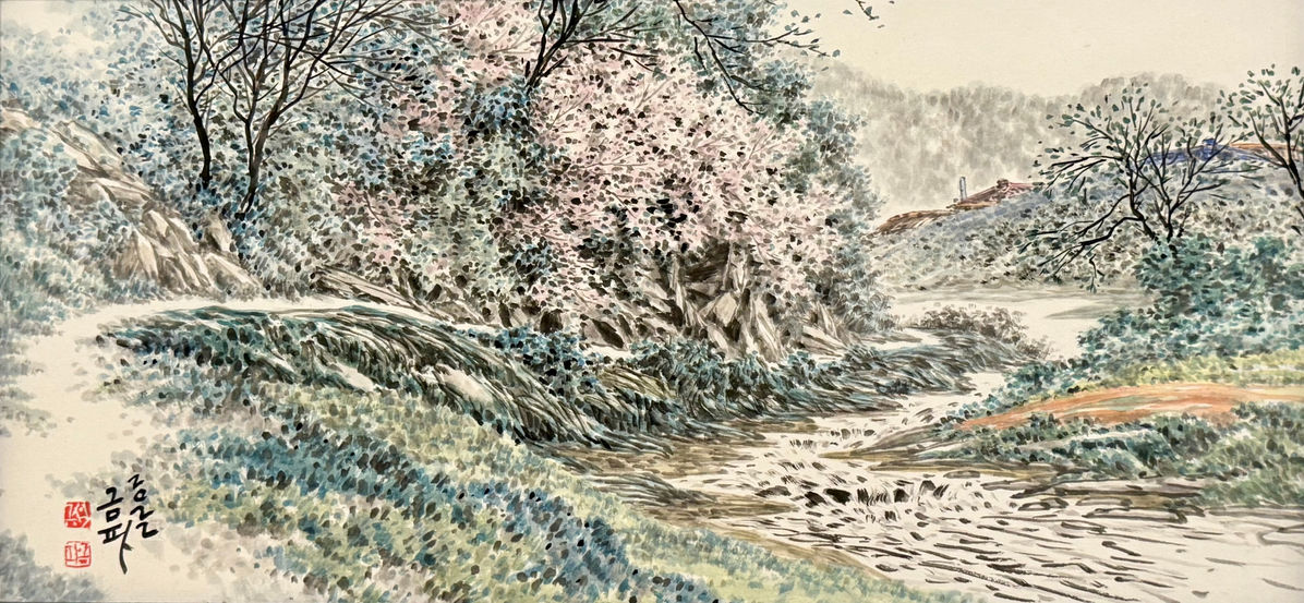 His early works explored subtle ink landscapes and quiet rural scenes rendered with soft lines and muted tones. Later, Park began merging traditional techniques with modern aesthetics, experimenting with form, color, and composition to convey both Korean sentiment and personal resonance. Nature—homes, stones, trees, hanok—remains his core subject, as he “listens to the sound of nature through the eyes.”